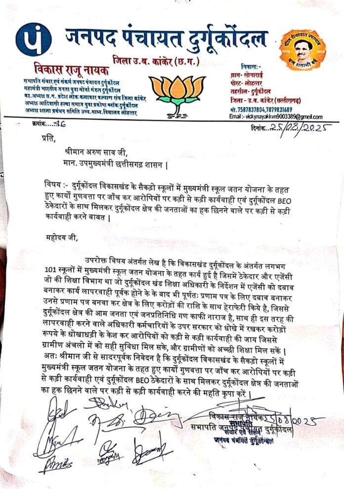 दूर्गकोंदल – मुख्यमंत्री स्कूल जतन योजना के तहत हुए निर्माण एवं मरम्मत कार्यों की गुणवत्ता पर सवाल खड़े करते हुए भाजपा युवा मोर्चा ने लिखित शिकायत दर्ज कराई है। इस संबंध में जनपद सदस्य एवं भाजपा युवा मोर्चा के महामंत्री राजू नायक के नेतृत्व में कार्यकर्ताओं ने प्रदेश के उपमुख्यमंत्री एवं कांकेर जिला प्रभारी अरुण साव को आवेदन सौंपा।आवेदन में कहा गया है कि योजना के अंतर्गत किए गए स्कूल भवन मरम्मत कार्यों में गंभीर अनियमितताएं एवं लापरवाही की गई है। कार्य की गुणवत्ता पर संदेह जताते हुए जांच की मांग की गई है। साथ ही दोषियों पर कड़ी कार्रवाई करने की अपील भी की गई है।भाजपा युवा मोर्चा का कहना है कि शिक्षा जैसे संवेदनशील क्षेत्र में इस तरह की लापरवाही किसी भी स्थिति में बर्दाश्त नहीं की जाएगी। यदि समय रहते जांच कर दोषियों पर कार्यवाही नहीं की जाती तो आंदोलनात्मक कदम उठाने की चेतावनी भी दी गई है।