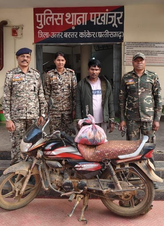 परलकोट दर्पण लोकल न्यूज ◆पखांजूर पुलिस की बड़ी कार्रवाई: 885 ग्राम गांजा के साथ आरोपी गिरफ्तार पखांजूर। अवैध मादक पदार्थों के विरुद्ध चलाए जा रहे अभियान के तहत पखांजूर पुलिस ने बड़ी कार्रवाई करते हुए 885 ग्राम गांजा के साथ एक आरोपी को गिरफ्तार किया है। पुलिस ने आरोपी के कब्जे से गांजा के अलावा एक बिना नंबर की मोटरसाइकिल, इलेक्ट्रॉनिक तौल मशीन एवं मोबाइल फोन भी बरामद किया है।पुलिस से मिली जानकारी के अनुसार, पुलिस अधीक्षक श्री निखिल अशोक राखेचा के निर्देशन में संचालित उजियारा अभियान के तहत 12 फरवरी 2026 को मुखबिर से सूचना प्राप्त हुई कि एक व्यक्ति अवैध रूप से गांजा का परिवहन कर रहा है। सूचना के आधार पर पुलिस टीम ने ग्राम पीव्ही-37 रूपनगर चेक तिराहे पर घेराबंदी कर आरोपी गुरूपद विश्वास (33 वर्ष), निवासी ग्राम पीव्ही-21 दुर्गापुर, थाना पखांजूर को पकड़ा।तलाशी के दौरान आरोपी की मोटरसाइकिल की डिग्गी से 885 ग्राम गांजा बरामद किया गया। इसके साथ ही परिवहन में प्रयुक्त मोटरसाइकिल, इलेक्ट्रॉनिक तौल मशीन एवं मोबाइल फोन जब्त किया गया।आरोपी के विरुद्ध थाना पखांजूर में अपराध क्रमांक 34/2026, धारा 20(बी)(ii)A एनडीपीएस एक्ट के तहत प्रकरण दर्ज कर विधिवत कार्रवाई करते हुए उसे न्यायिक हिरासत में जेल भेज दिया गया है।इस कार्रवाई में निरीक्षक लक्ष्मण केवट, सहायक उप निरीक्षक बिंदुलता देवांगन सहित पुलिस टीम के अन्य सदस्यों की सराहनीय भूमिका रही। कांकेर पुलिस ने आम नागरिकों से अपील की है कि किसी भी संदिग्ध अथवा आपराधिक गतिविधि की सूचना हेल्पलाइन नंबर 94791-55125 पर दें। सूचनाकर्ता की पहचान पूर्णतः गोपनीय रखी जाएगी।