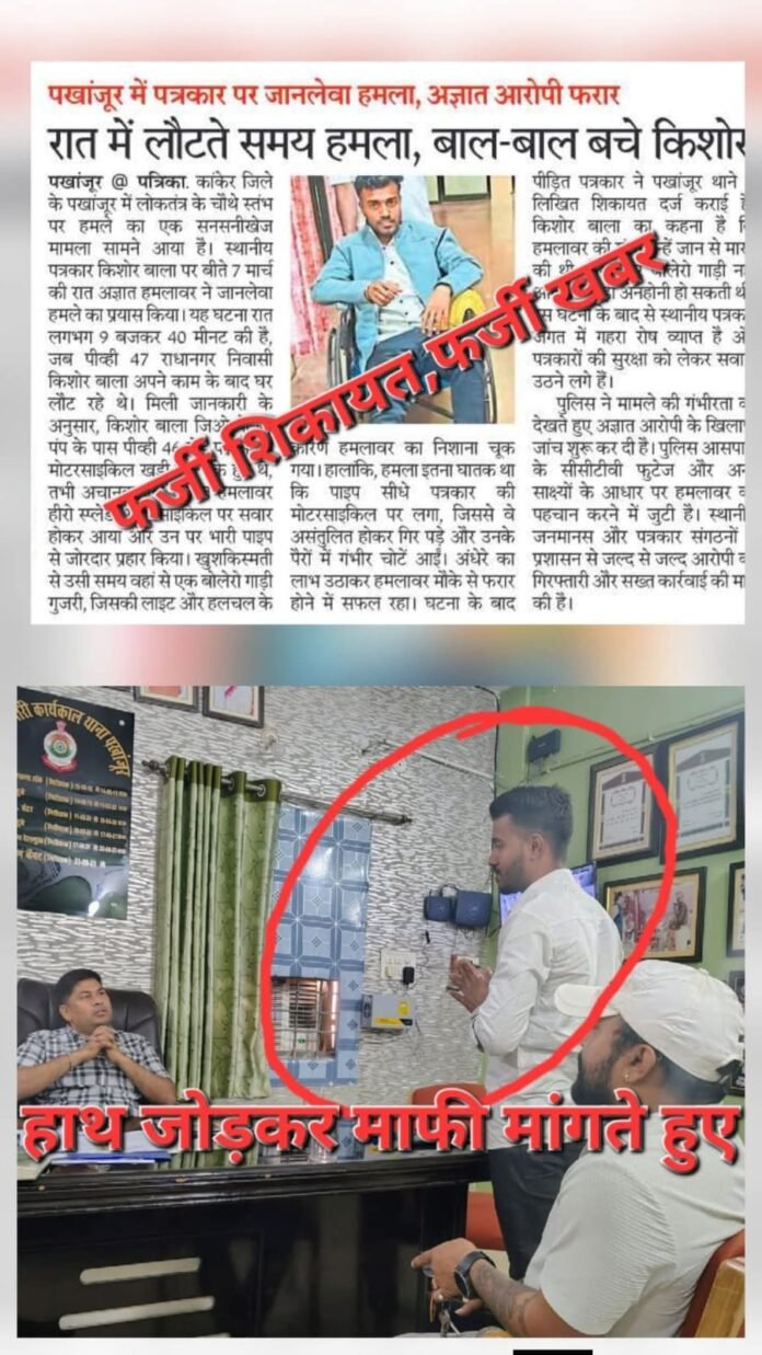 पखांजूर, कांकेर, छत्तीसगढ़ —-: पत्रकारिता जैसे सम्मानजनक पेशे को कलंकित करने और पुलिस प्रशासन को झूठी शिकायत देकर गुमराह करने वाले एक तथाकथित ‘फर्जी पत्रकार’ के कारनामों का पखांजूर पुलिस ने पर्दाफाश कर दिया है। खुद को पत्रकार बताने वाले किशोर बाला नाम के युवक ने बीते दिनों थाने में शिकायत दर्ज कराई थी कि उन पर जानलेवा हमला हुआ है, लेकिन जांच में यह मामला पूरी तरह फर्जी पाया गया।क्या था पूरा मामला?हाल ही में किशोर बाला ने सोशल मीडिया और अखबारों में यह खबर फैलवाई थी कि जब वह अपने घर लौट रहे थे, तब एक अज्ञात हमलावर ने उन पर लोहे की पाइप से हमला किया। उन्होंने दावा किया था कि इस हमले में वह बाल-बाल बचे और गंभीर रूप से घायल हो गए। इस खबर के बाद स्थानीय पत्रकार जगत और आम जनता में सुरक्षा को लेकर चिंता व्याप्त हो गई थी।CCTV ने खोली ‘हमले’ की पोलमामले की गंभीरता को देखते हुए पखांजूर पुलिस ने जब घटनास्थल के आसपास के CCTV फुटेज खंगाले, तो हकीकत कुछ और ही निकली। फुटेज में साफ देखा गया कि किशोर बाला पर किसी ने कोई हमला नहीं किया था, बल्कि वह खुद ही अपनी मोटरसाइकिल से अनियंत्रित होकर गिर गए थे। अपनी इस दुर्घटना को उन्होंने ‘सुनियोजित हमले’ का रूप देकर पुलिस में झूठी एफआईआर दर्ज कराने की कोशिश की।थाने में मांगी माफी, पुलिस की सख्त चेतावनीसच सामने आने के बाद, फर्जी पत्रकार किशोर बाला को थाने तलब किया गया। वायरल हो रही तस्वीरों में साफ देखा जा सकता है कि वह पुलिस अधिकारियों के सामने हाथ जोड़कर अपनी गलती की माफी मांग रहे हैं। पुलिस प्रशासन ने इस मामले में कड़ा रुख अपनाते हुए आरोपी को सख्त चेतावनी दी है कि:भविष्य में यदि वह दोबारा फर्जी तरीके से खुद को पत्रकार बताकर घूमते या लोगों को डराते-धमकाते पाए गए, तो उन पर कठोर कानूनी कार्रवाई की जाएगी।पत्रकारिता के नाम पर अवैध वसूली या गलत जानकारी फैलाने वालों को बख्शा नहीं जाएगा।असली पत्रकारों की छवि को नुकसानक्षेत्र के वरिष्ठ और वास्तविक पत्रकारों का कहना है कि किशोर बाला जैसे लोग न केवल प्रशासन का समय बर्बाद करते हैं, बल्कि समाज के ‘चौथे स्तंभ’ की विश्वसनीयता को भी ठेस पहुँचाते हैं। इस तरह के फर्जी पत्रकारों के कारण ही ईमानदारी से काम करने वाले फील्ड पत्रकारों को भी शक की निगाह से देखा जाता है।